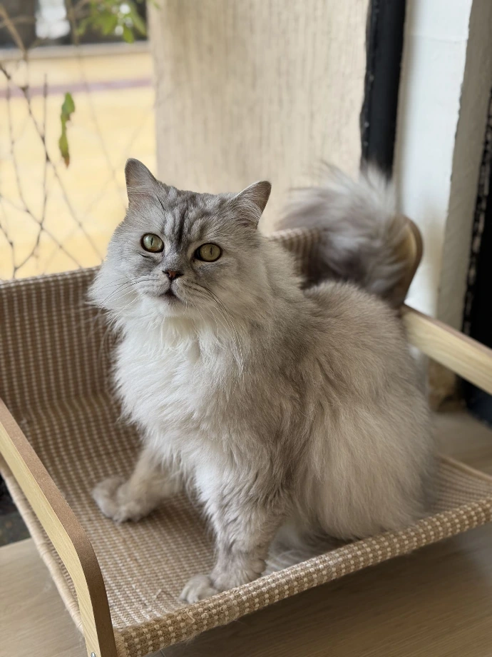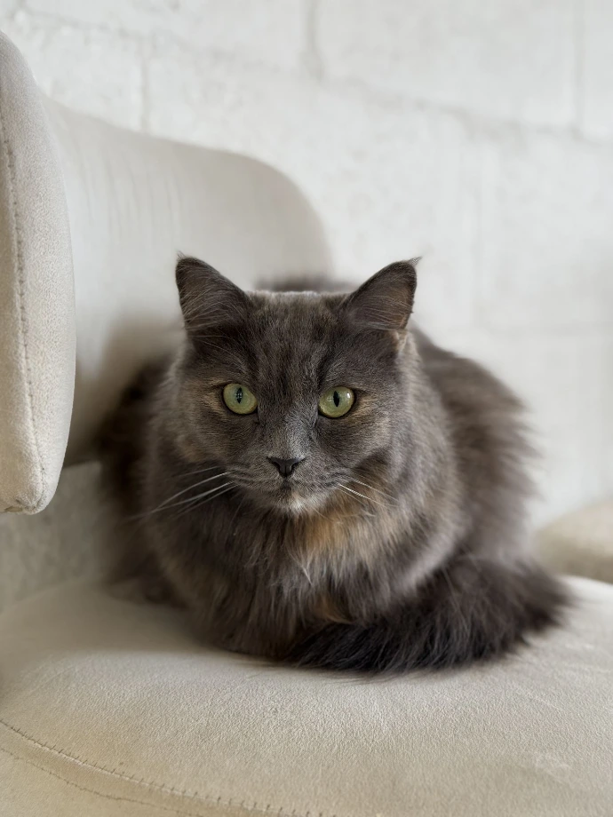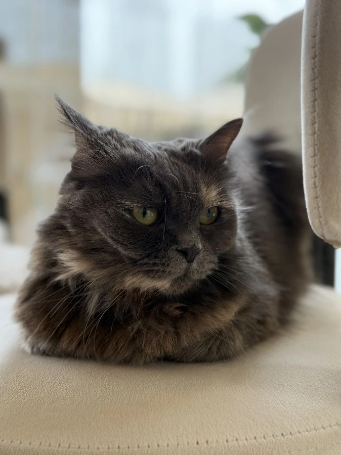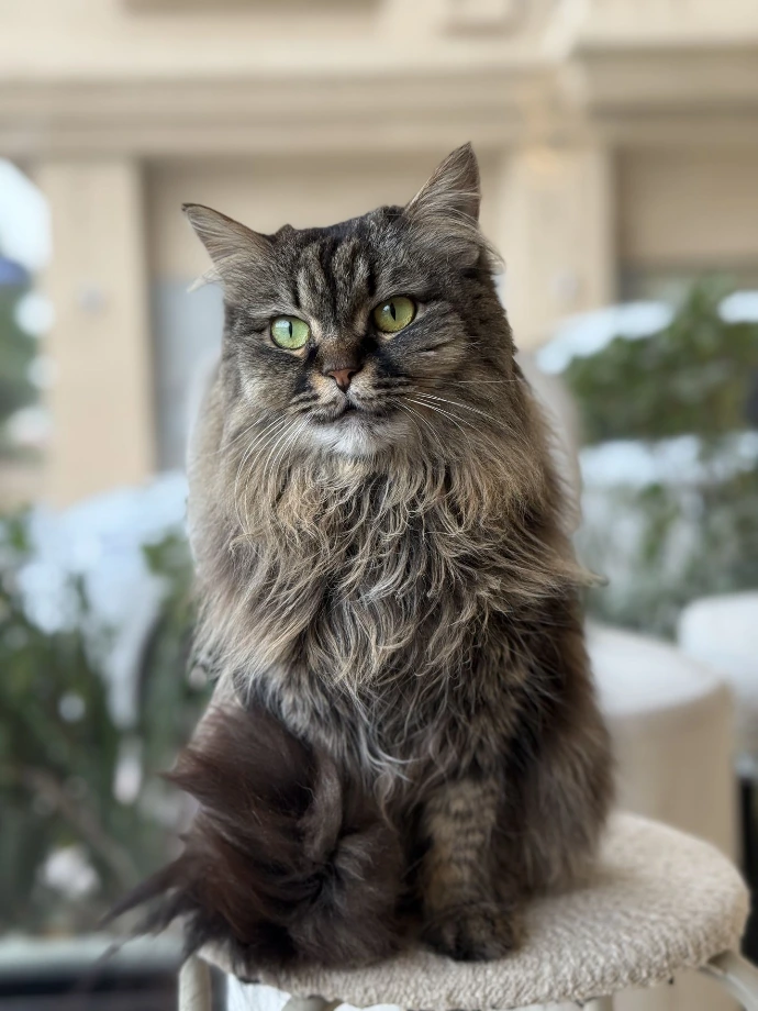 Tidbit: Nymeria is one of Pompom's children, along with Pizza and Levi. Her favorite perch? A staff member's shoulder, where she sits like a purring parrot. The doctor keeps reminding everyone about posture, but who's going to argue with a queen?