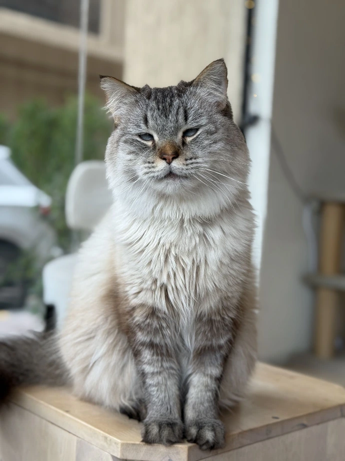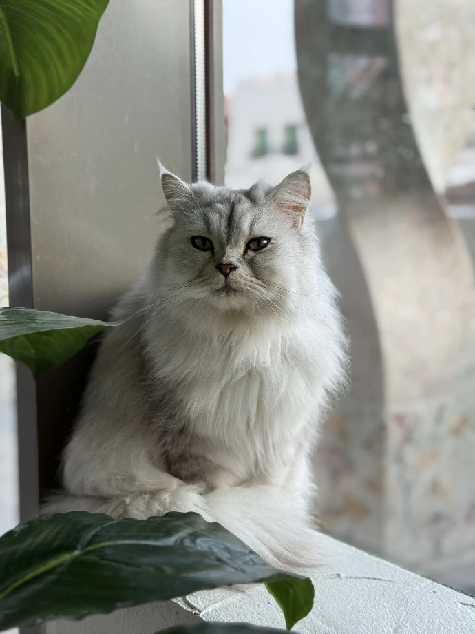 If you see a silver-coated feline leaning against the glass, it's likely Wolfina chilling under the sun. Treats? Meh. That constant frown? Don't take it personally. She's simply the kind of cat that prefers life's quiet pleasures, like sunbathing.