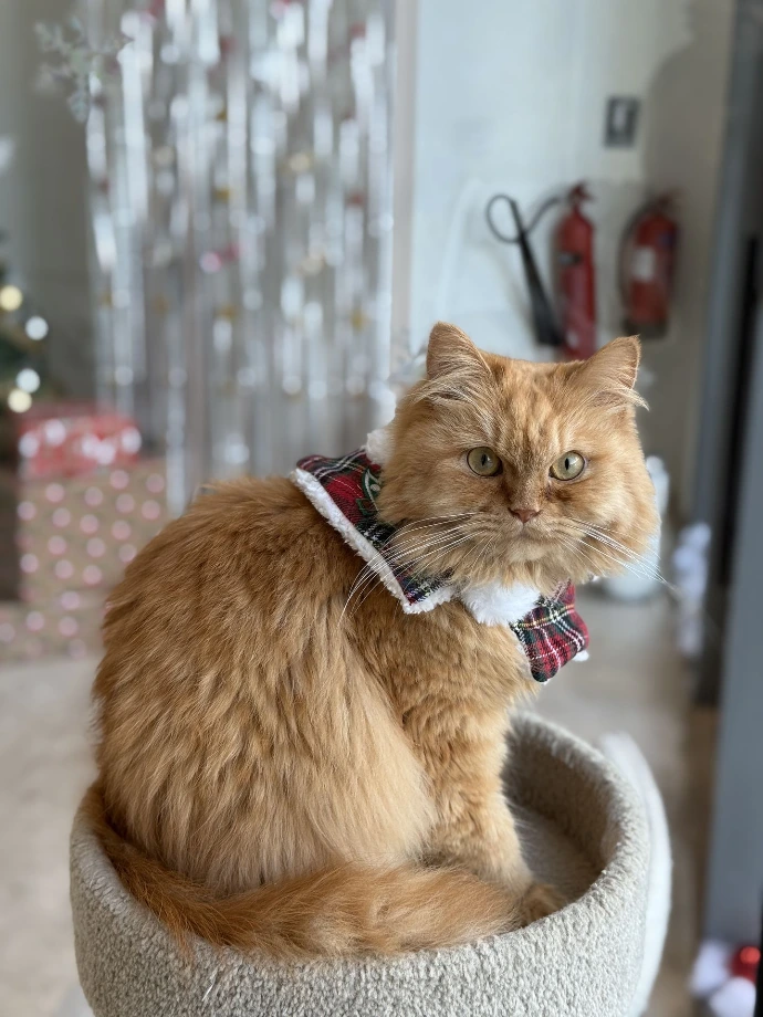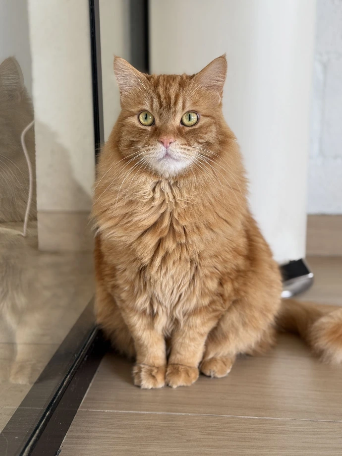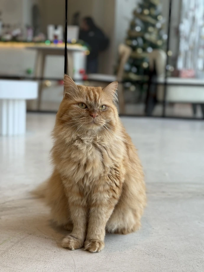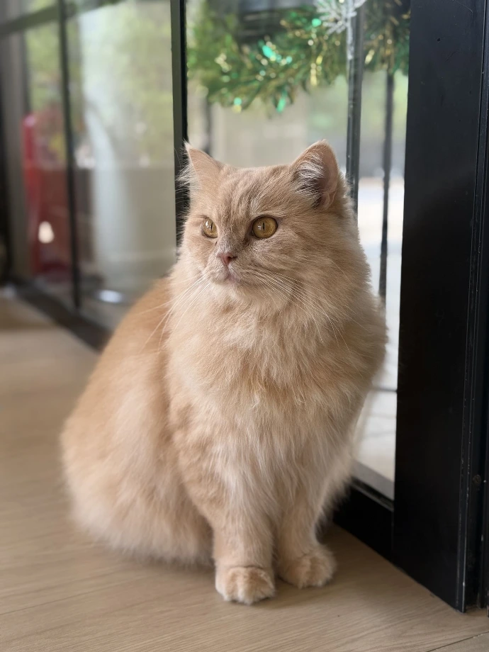 Those yellow-orange highlights prove that Mango is just as sweet as the fruit. You may find him napping on chairs or lying on the cat wheel. When he's ready for attention, he can make the cat wheel shake with extreme speeds. Watch the show while it lasts.