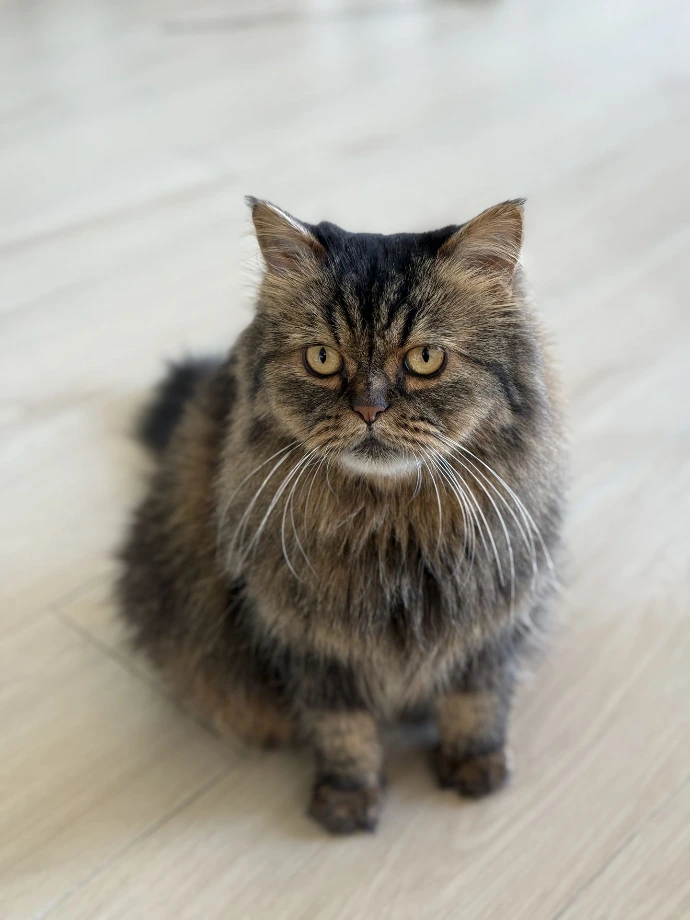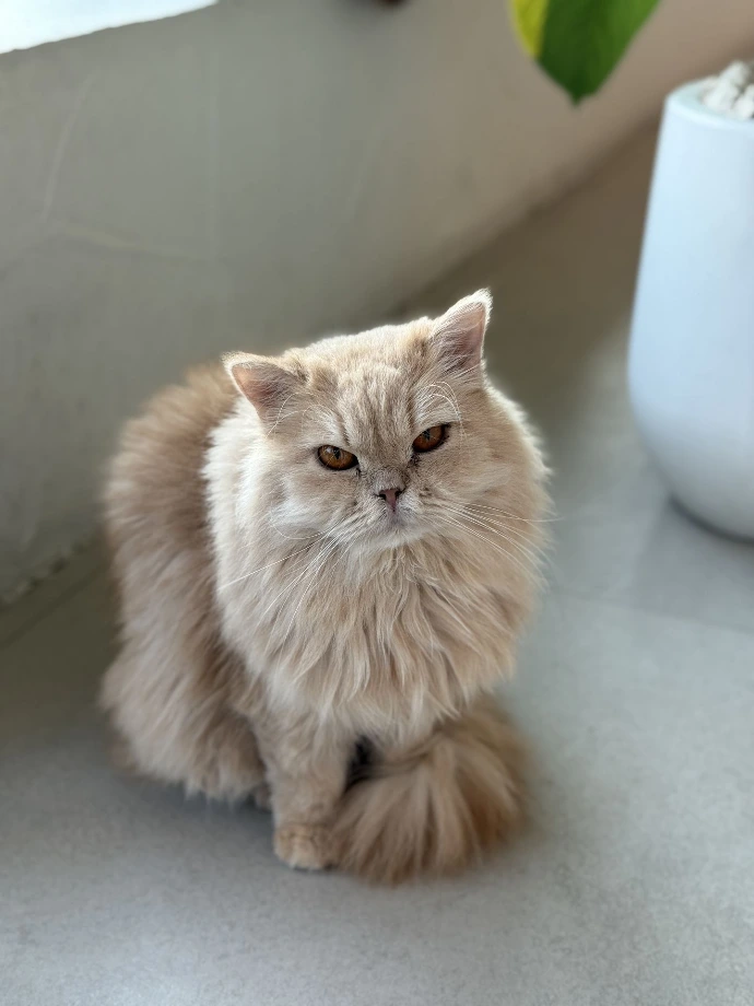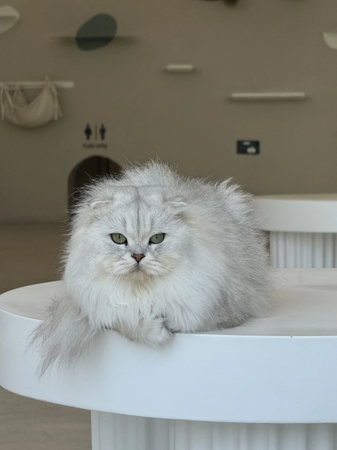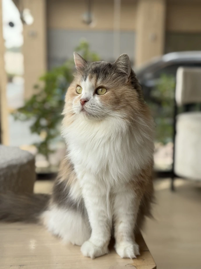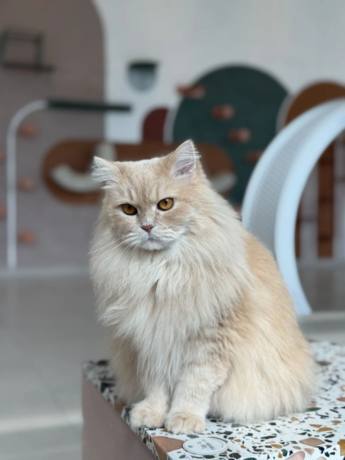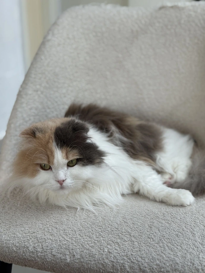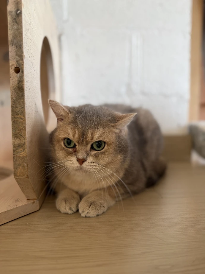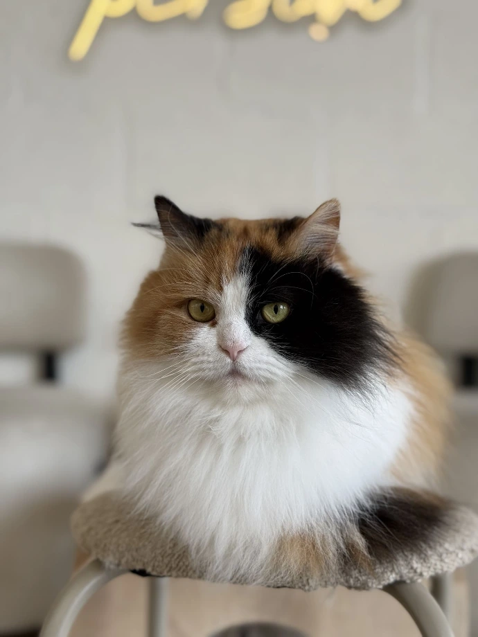 Soft, sweet, and delightfully fluffy, Pancake is exactly what her name promises. She's one of our resident cozy-lazy kitties, often found loafing on the cat wall like adorable decor.