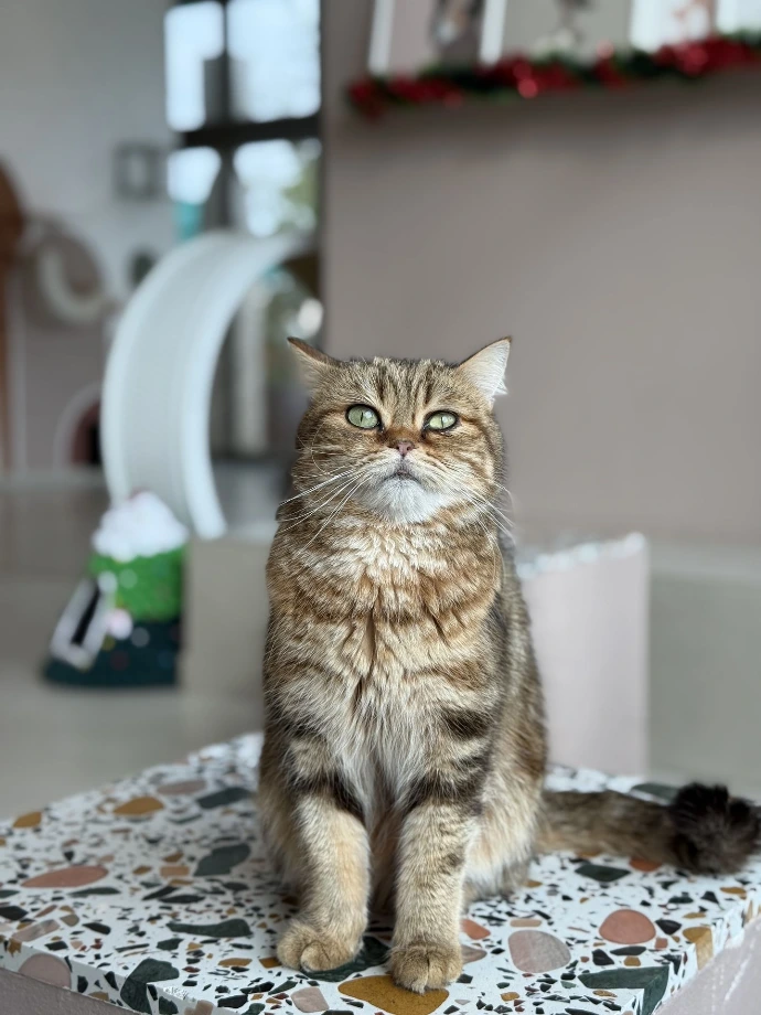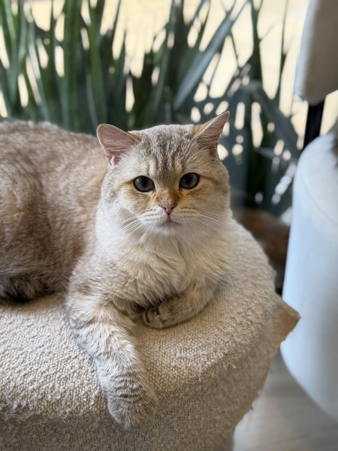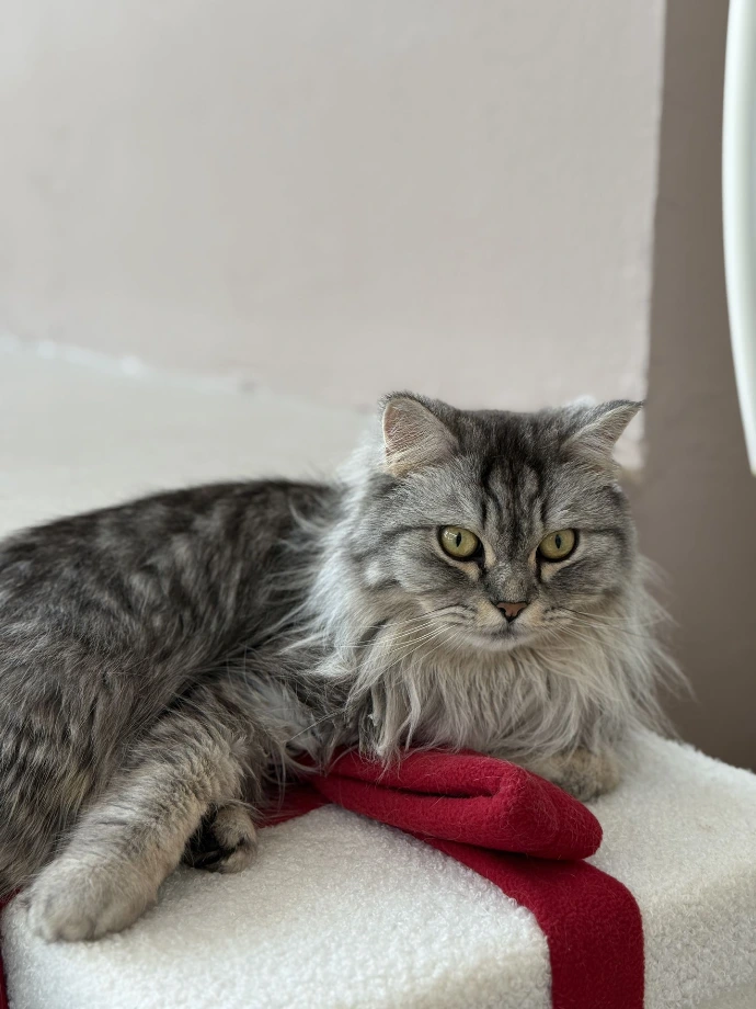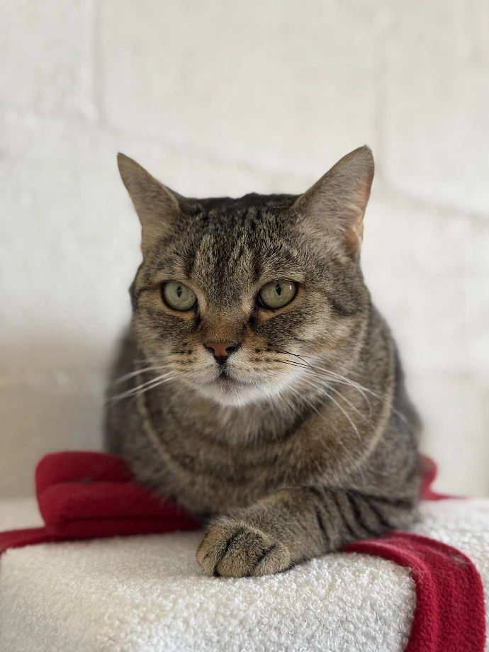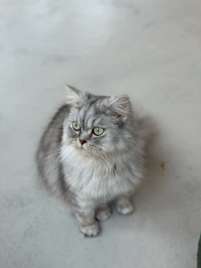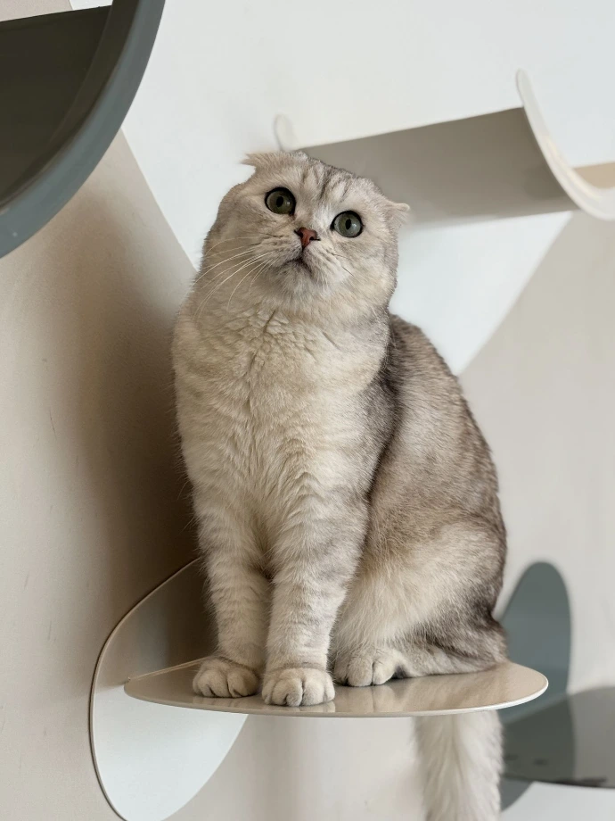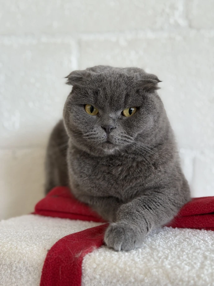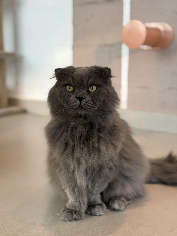 A Scottish Fold with short grey fur that looks just a bit judgmental? Well, that's Teddy. While her name fits her cozy lifestyle and teddy bear-like appearance, don't let it fool you.