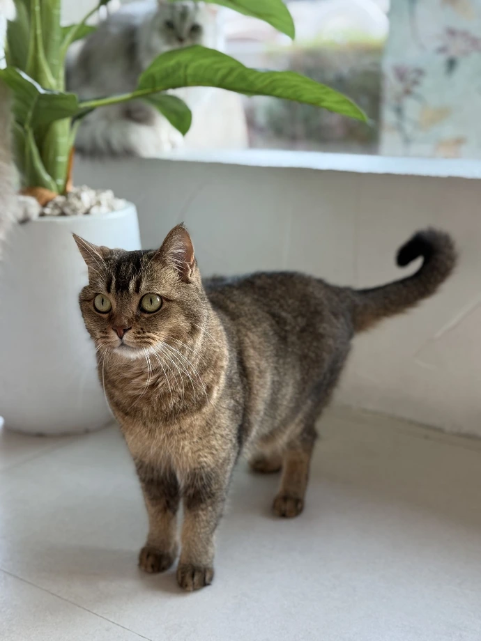 Popcorni is a gentle soul with round green eyes that peek shyly from quiet corners. While she may seem reserved at first, Popcorni has a special way of showing affection: grooming people with soft and dedicated licks. It's her personal seal of approval.