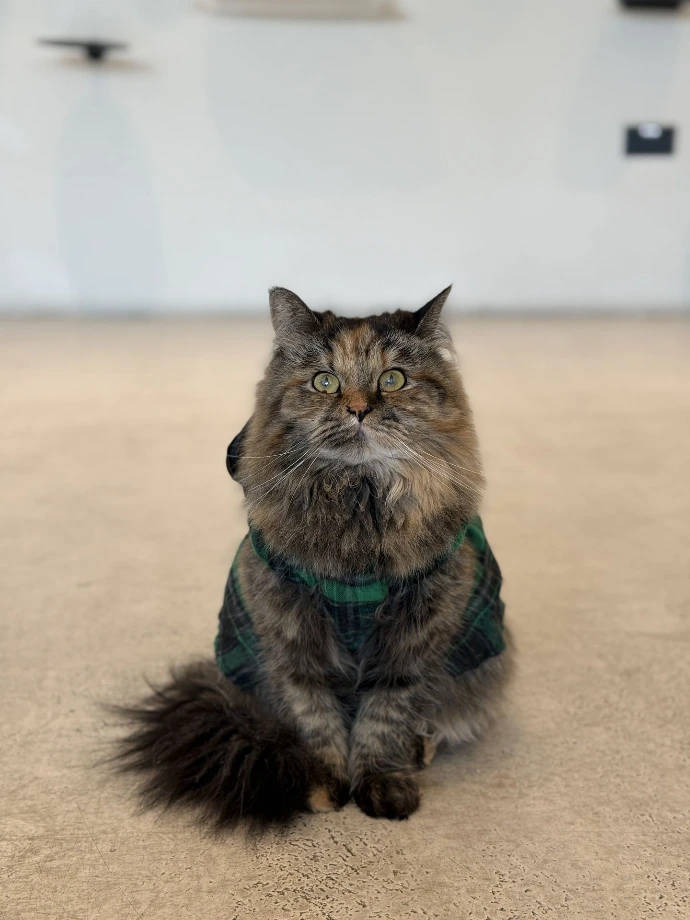If you see a calico batting around a ping pong ball like a professional athlete, that's probably Matcha. If you see a fluffy cat screaming as she trots after a staff member, that's definitely Matcha.